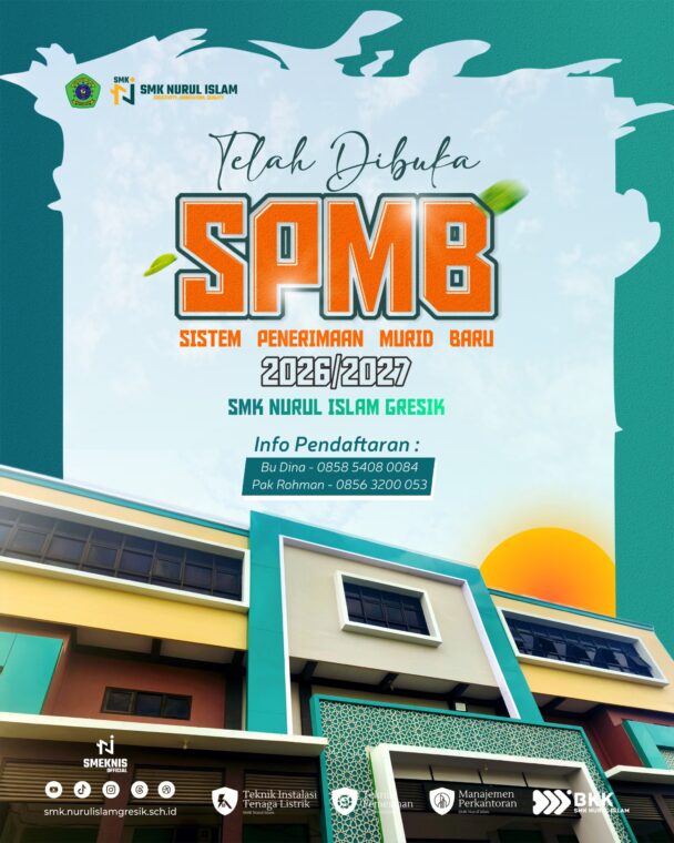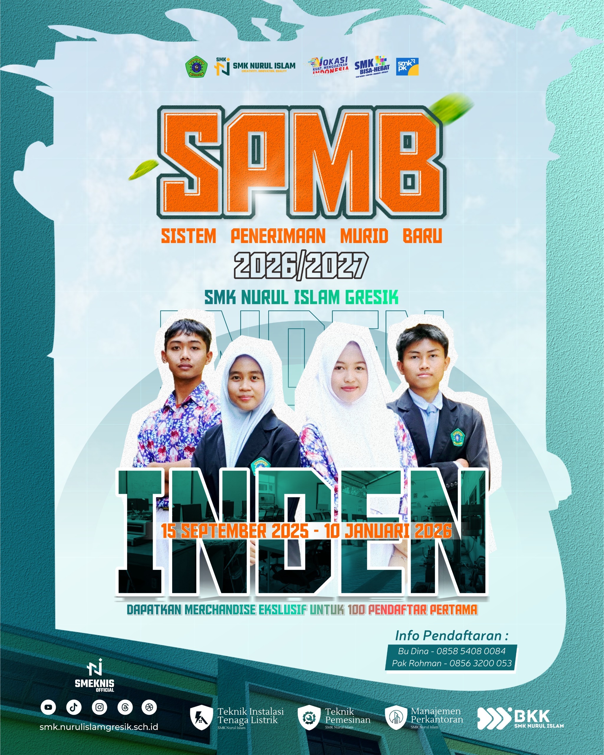 Sistem Penerimaan Murid Baru (SPMB) Periode 2026-2027 SMK Nurul Islam Gresik JALUR INDEN 15 September 2025 – 10 Januari 2026 – 100 EXLUSIVE GIFT (Untuk 100 Pendaftar Pertama) – EDU VOUVHER (SPP 9 Bulan) GELOMBANG 1 10 Januari 2026 – 31 Maret 2026 EDU VOUCHER (SPP 5 Bulan) GELOMBANG 2 01 April 2026 – 30 Juni 2026 EDU VOUCHER (SPP 3 Bulan) GELOMBANG 3 01 Juli 2026 – Kuota Terpenuhi PROGRAM KHUSUS + PRESTASI 1. KHUSUS + BEASISWA – Alumni MTS Nurul Islam Gresik – Anak Guru di Lingkungan Yanuris – Yatim Piatu (Melampirkan akta kematian ayah dan ibu) – Yatim (Melampirkan akta kematian ayah) 2. PRESTASI – Nasional – Provinsi – Kabupaten – Kecamatan (untuk juara 1-3 di setiap tingkatan) – Peringkat 1-2 (Selama 3 Semester terakhir)
